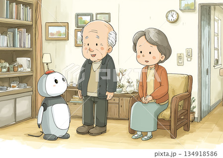 AIロボットに相談する高齢夫婦の横顔イラスト 未来的コミュニケーション