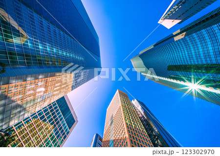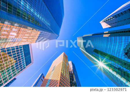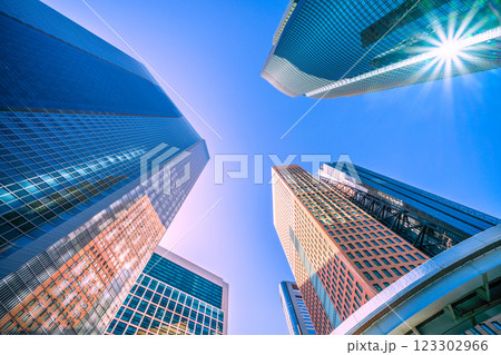 日本の東京都市景観 珍景万華鏡都市。強い光を浴びて汐留タワーが周囲のビルにくっきりと映り込む光景…