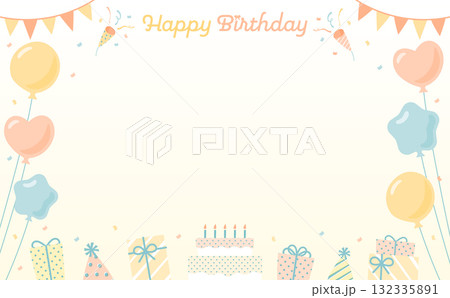 黄色い誕生日カードの背景イラスト :フレームの中にケーキと風船とプレゼントとクラッカーのデザイン