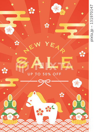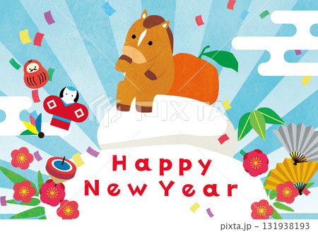 馬(午年)の置物と日の出と門松の年賀状向け背景イラスト