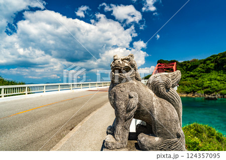 沖縄の青い海と笑顔のシーサーたち 風景写真 コピースペース