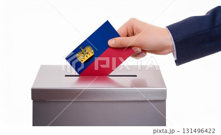 リヒテンシュタインの国旗の投票用紙を投票する手と投票箱。選挙。