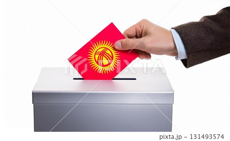 キルギスの国旗の投票用紙を投票する手と投票箱。選挙。