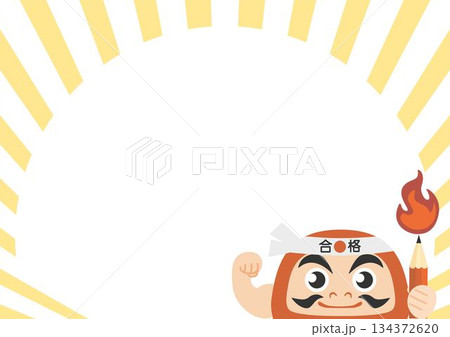 合格のハチマキをした力強いだるまと炎の鉛筆、集中線とコピースペースのある受験、成功のベクターイラスト