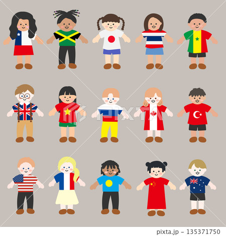 国旗風の服を着たバラエティ豊かな子供たちのイラストセット