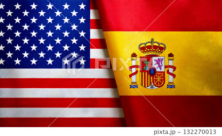 Torn flags of the United States and Spain symbolize geopolitical tension and conflict. The fabric shows intricate details of both nations' emblems and colors.