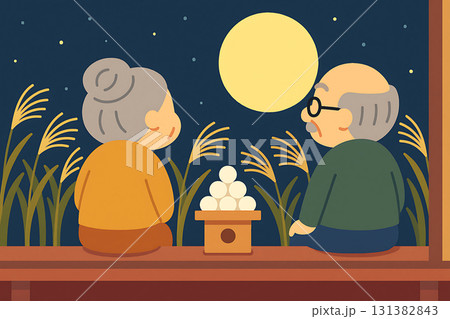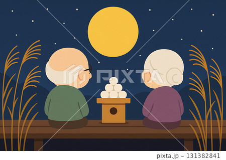 お月見・十五夜の団子と満月の風景 秋の風物詩を描いた素材