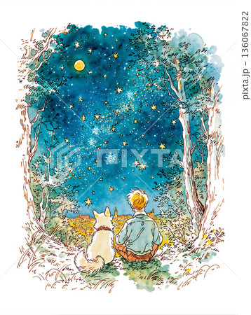 星空を見上げる犬と少年