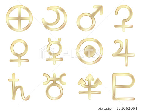 天体記号のアイコンセット金色 地球 月 太陽 水星 金星 火星 木星 土星 海王星 冥王星 天王星