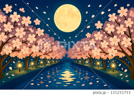 夜桜 桜並木 ライトアップ 満月 運河 ベクター