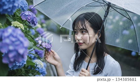 紫陽花と雨の日 傘をさす女性