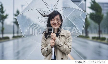 強風で傘をあおられる女性