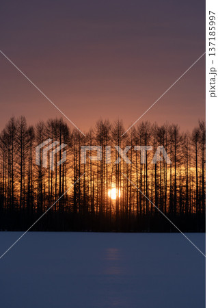 雪原のハサ木朝焼けの夜明け