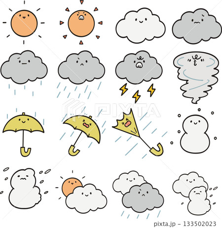 天気のアイコンイラスト。天気予報。晴れ、雲、雨、雪、花粉などの自然現象。カラー素材。