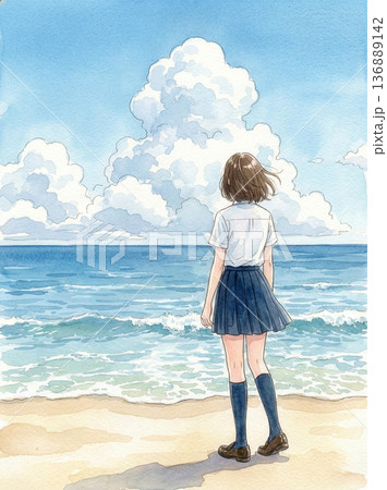 海を見つめる女子高生 水彩画風