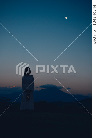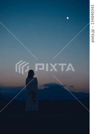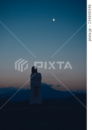 月が浮かぶ夕暮れの山で佇む女性のシルエット