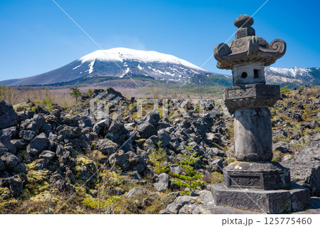 残雪の浅間山と鬼押出し園の浅間山観音堂