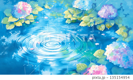 雨の山の池の風景、アニメ風