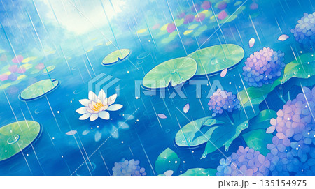 幻想的な蓮池の風景イラスト 自然 風景 水面 水辺 水蓮 森 林 木々 癒し 清涼感 リラックス