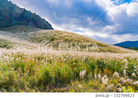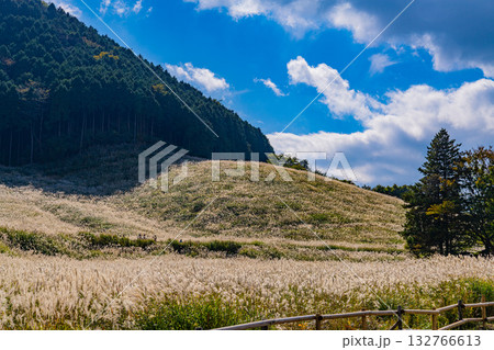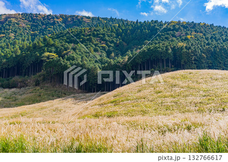 「静岡県」芒が広がる秋の朝霧高原と富士山