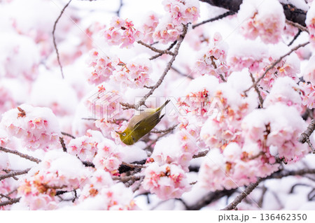 立春・雪の積もった寒桜とメジロ
