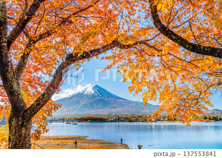 【富士山素材】秋の河口湖から見る冠雪した富士山と紅葉【山梨県】
