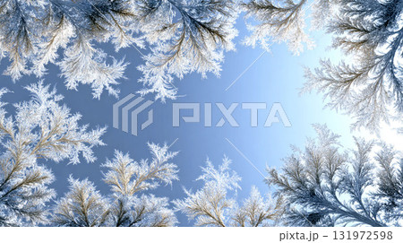 冬の青空と氷の結晶が彩る霜のフレーム背景