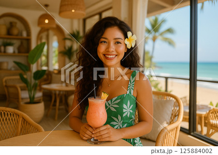 ハワイのビーチカフェでトロピカルドリンクを楽しむ女性