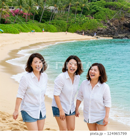 ハワイの海辺でアイスクリームを楽しむ笑顔の女性