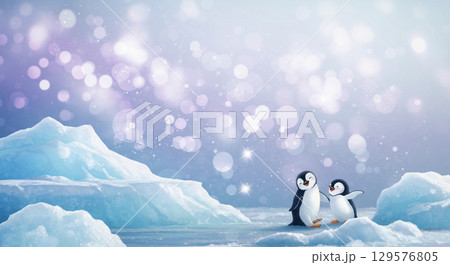 キラキラ輝く氷の世界にいるペンギン達
