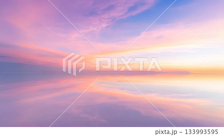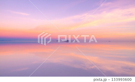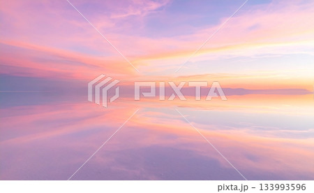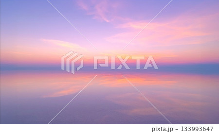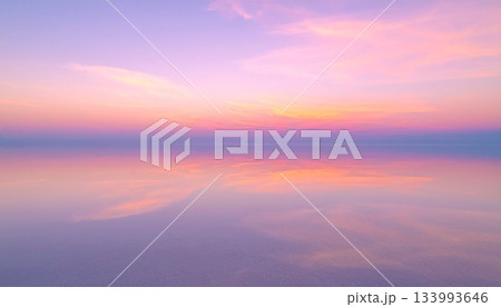 ウユニ塩湖のような鏡面反射の絶景 パステルピンクの夕焼け空の風景 マジックアワー