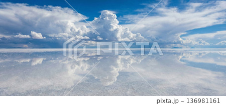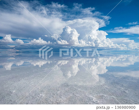 空の雲が、完璧に水面に反射する薄く水が張った広大な塩湖