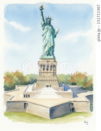 青空の下で堂々と立つアメリカ・ニューヨークの自由の女神像を描いた水彩イラスト
