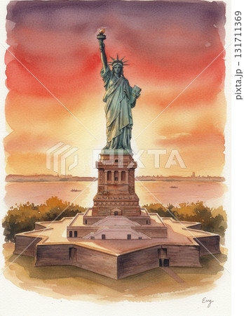 夕日の下で堂々と立つアメリカ・ニューヨークの自由の女神像を描いた水彩イラスト