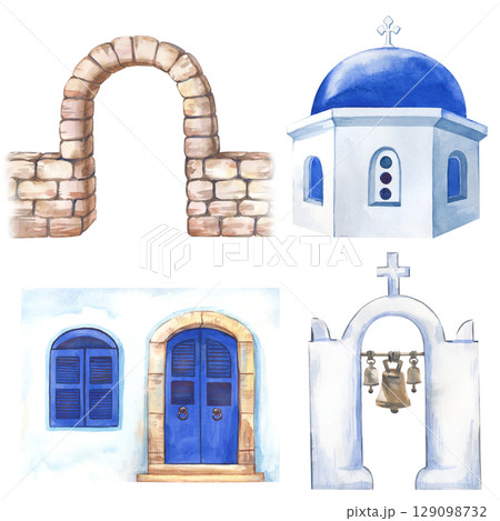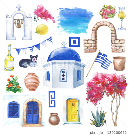A set of hand drawn elements of Greece. Motives of Santorini. The watercolor illustration is isolated on a white background. A template for travel booklets, postcards, and scrapbooking.