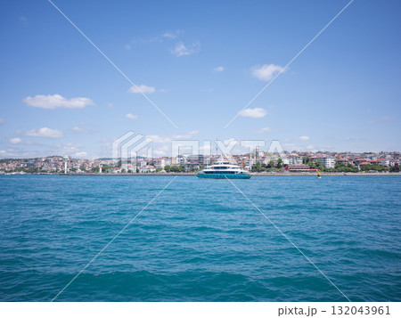 【トルコ】イスタンブールの沿岸部から望むボスポラス海峡の海と航行する船と対岸の街並み