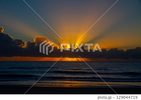 オーストラリア クイーンズランド州ゴールドコーストのビーチより水平線から昇る朝陽と光芒の眺め