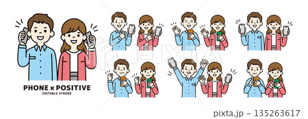スマートフォンを持った若い男女・夫婦の様々な表情・ポーズのベクターイラスト素材セット_カラー