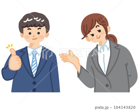 サムズアップするビジネスマン 手差しで案内するビジネスウーマン