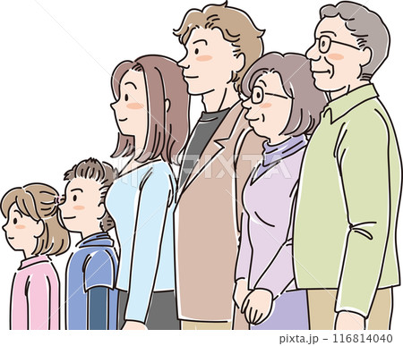 色々な年代の人物_横向き_普通の表情_3世代6人家族_小学生_両親_祖父母t