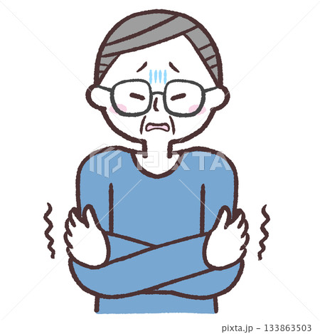 青ざめた顔で震えている私服の若い男性(上半身・正面)