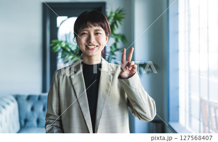 Vサインの女性
