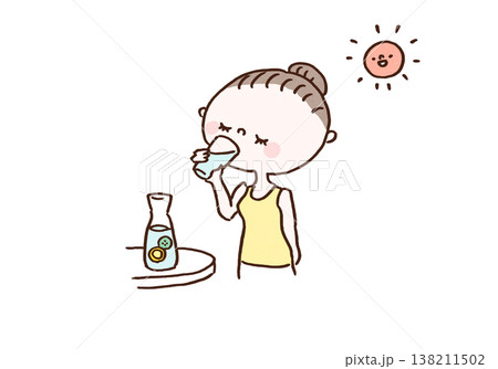 朝の光の中でグラス一杯のデトックスウォーター(レモン水)を飲む女性のイラスト(健康・美容)
