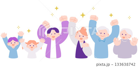 笑顔で万歳をする、三世代の男性と女性のシンプルな全身ベクターイラスト素材セット