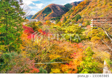 栃木県日光市 秋の紅葉に染まる鬼怒川温泉の風景