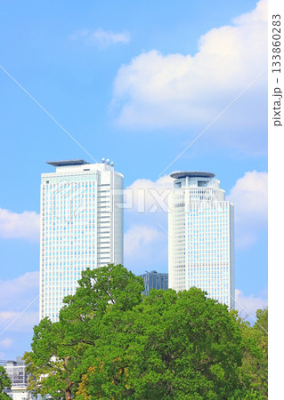 愛知県名古屋市、米野公園から見た名古屋駅周辺超高層ビル群の風景