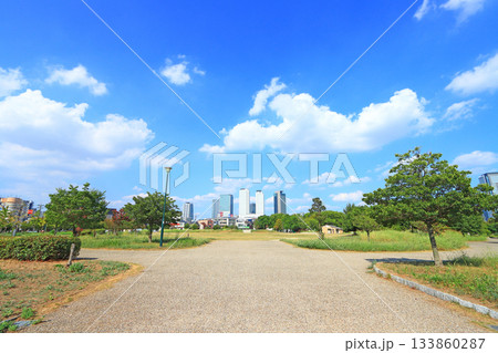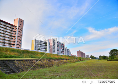 《愛知県》名古屋都市風景 矢田川河川敷公園とマンション