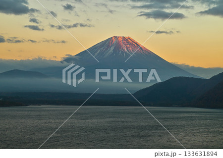 【富士山素材】山中湖明神山パノラマ台から見る雲をかぶった富士山の朝焼け【山梨県】
