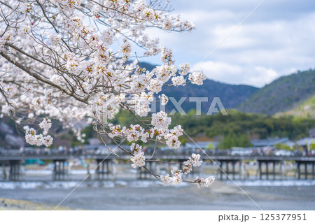 京都嵐山 渡月橋と満開の桜 中之島公園より