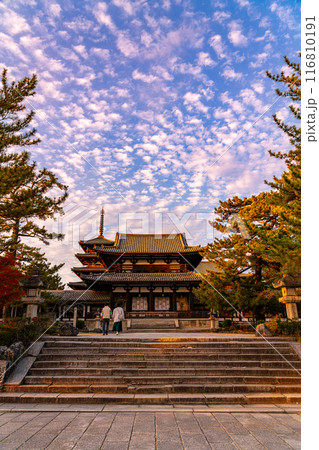 【奈良県】ダイナミックな夕暮れの秋空が広がる法隆寺